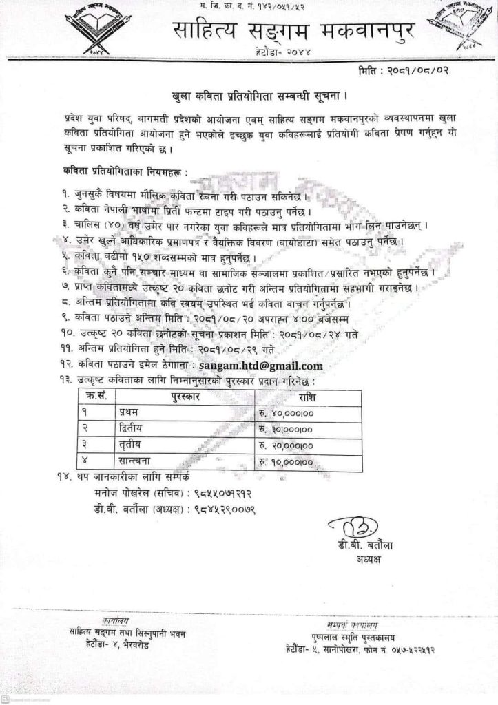 ‘जुनसुकै विषयमा मौलिक कविता रचना गरी प्रिती फन्टमा टाइप गरी पठाउनु पर्नेछ । कविता पठाउने अन्तिम मिति मङ्सिर २० गते रहेको छ । प्राप्त कवितामध्ये उत्कृष्ट २० कविता छनौट गरी अन्तिम प्रतियोगितामा सहभागी गराइनेछ ।’ आयोजकले जारी गरेको सूचनामा उल्लेख गरिएको छ । कविता sangam.htd@gmail.com मा पठाउनु पर्ने छ ।