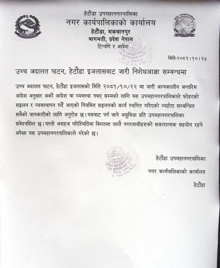 मङ्गलबार उच्च अदालत पाटन, हेटौँडा इजलासले राप्ती नदी तटमा अर्को आदेश नभए सम्मका लागि फोहोर नफाल्न उपमहानगरपालिकाका नाममा निषेधाज्ञा जारी गरेसंगै फोहोर सङ्कलन तथा व्यवस्थापन स्थगित भएको उपमहानगरपालिकाले जनाएको छ ।