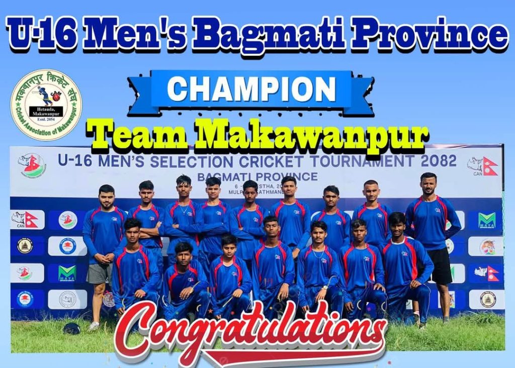 हेटौँडा, शिवशक्ति महतोको शतकले मकवानपुर काठमाडौंमा जारी यु–१६ प्रदेशस्तरीय क्रिकेट छनोट प्रतियोगितामा अपराजित रहँदै च्याम्पियन बनेको छ।