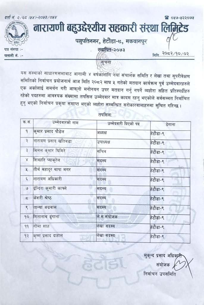 हेटौँडा, हेटौँडा–९ मा रहेको नारायणी बहुउद्देश्यीय सहकारी संस्था लिमिटेडको सञ्चालक समितिको अध्यक्षमा कुमार प्रसाद पौडेल चयन भएका छन् ।