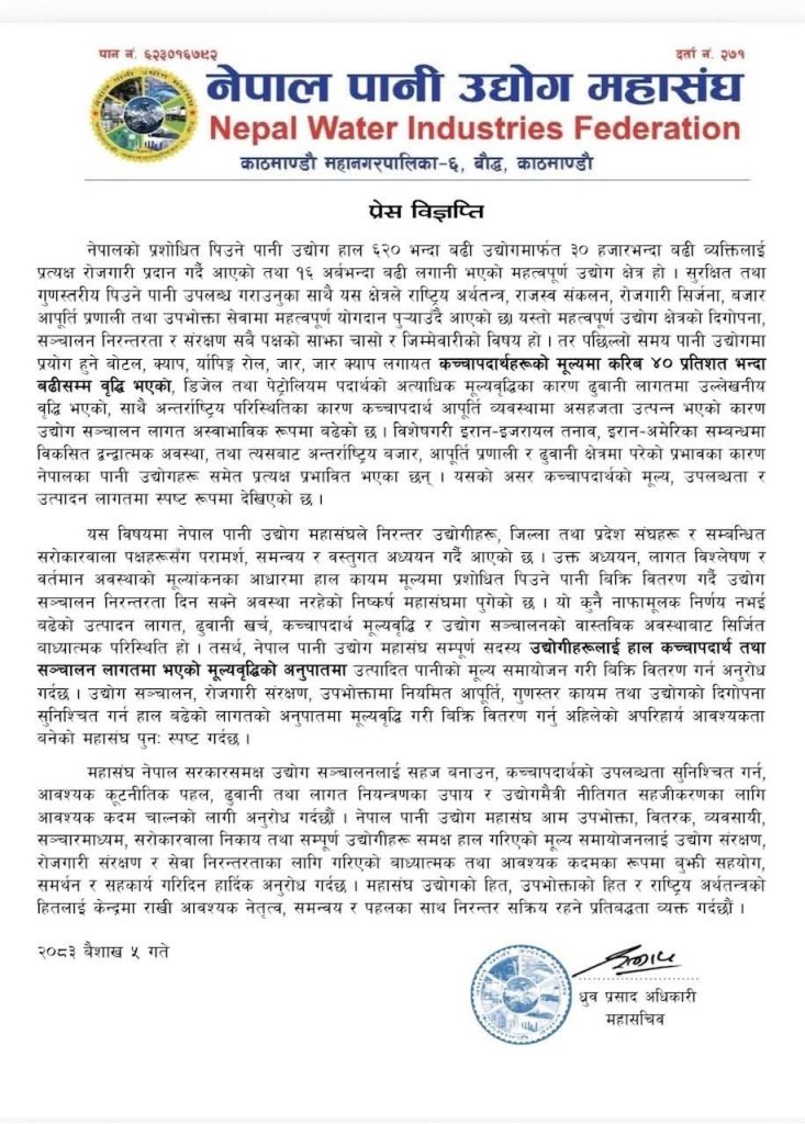 हेटौँडा, नेपाल पानी उद्योग महासंघले कच्चापदार्थ, ढुवानी तथा उत्पादन लागतमा अत्यधिक वृद्धि भएकाले प्रशोधित पिउने पानीको मूल्य समायोजन अपरिहार्य बनेको जनाएको छ। महासंघका महासचिव ध्रुव प्रसाद अधिकारीद्वारा शुक्रबार प्रेस विज्ञप्ति जारी गर्दै उद्योग सञ्चालन निरन्तरता, रोजगारी संरक्षण र उपभोक्तालाई गुणस्तरीय पानी उपलब्ध गराउन मूल्य समायोजन आवश्यक भएको उल्लेख गरेको हो।