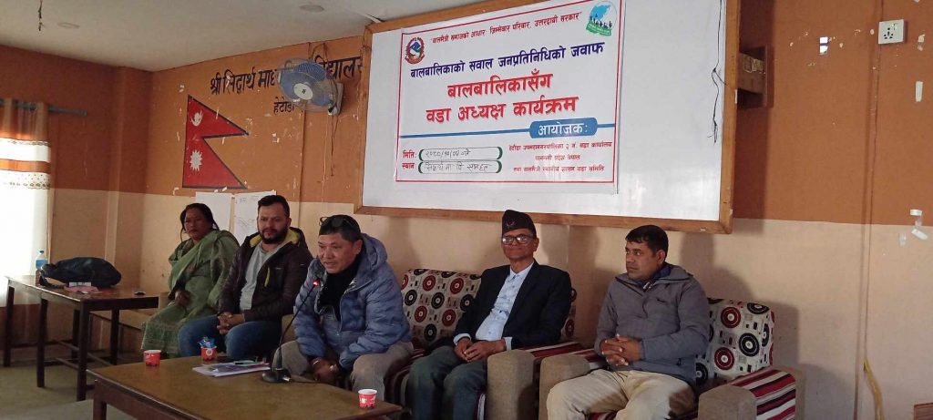 भर्खरै हामीले बाल समुहका १०० भन्दा धेरै बालबालिका सङ्ग तथा टोलबिकास संस्थाका प्रतिनिधि सङ्ग अन्तर्कृया कार्यक्रम गर्यौ र अब वडाका तीन वटै बिधालयमा बालबालिका सङ्ग वडा अध्यक्ष कार्यक्रम गर्दैछौ, वडा सदस्य सुरज बर्तौलाले बताए ।