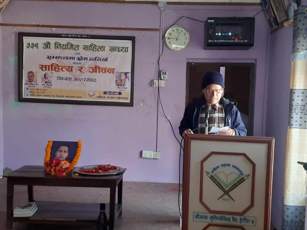 हेटौंडा, साहित्य सङ्गम मकवानपुरको आयोजनामा शनिबार हेटौंडामा भएको ३३९ औँ नियमित साहित्य सन्ध्या तथा खेम बानियाँ सम्झना साथमा साहित्य र जीवन विषय अन्तरसंवाद भएको छ ।