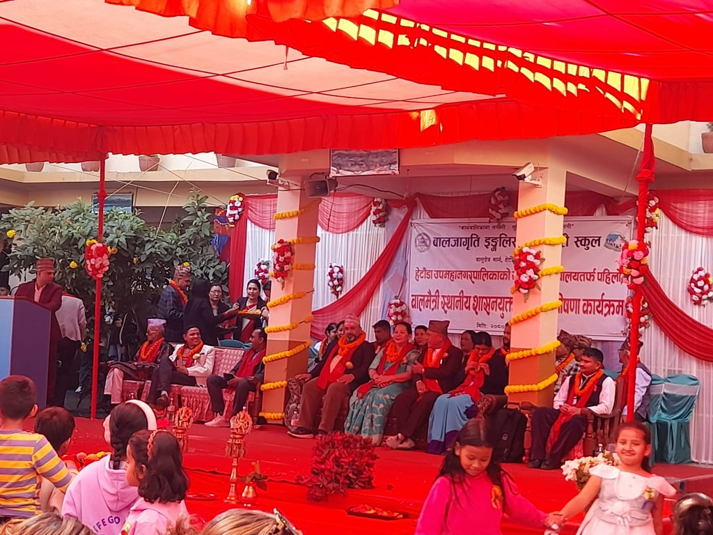 कार्यक्रममा बालजागृतिका स्काउट विद्यार्थीले मार्चपास गर्नुका साथै विद्यार्थीले गायन, नृत्य तथा बालमैत्री विषयमा नाटक प्रस्तुत गरेका थिए । कार्यक्रममा विद्यालयले पन्चेबाजा सहितको ¥यालीले नगर परिक्रमा गरेको थियो भने विद्यालयको प्राङ्गणमा शैक्षिक प्रदर्शनी र स्वास्थ्य शिविर कार्यक्रम भएको थियो । यस्तै हेटौँडा–१६ मा रहेको जनप्रिय माध्यमिक विद्यालय बालमैत्री विद्यालय घोषणा भएको छ । विद्यालयलाई बालमैत्री विद्यालय घोषणा गर्दै मेयर लामाले भनिन् –‘बालबालिकाको चौतर्फी विकास नभए सम्म समाज र देशको विकास हुन सक्दैन ।’