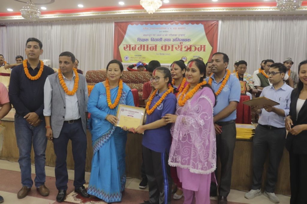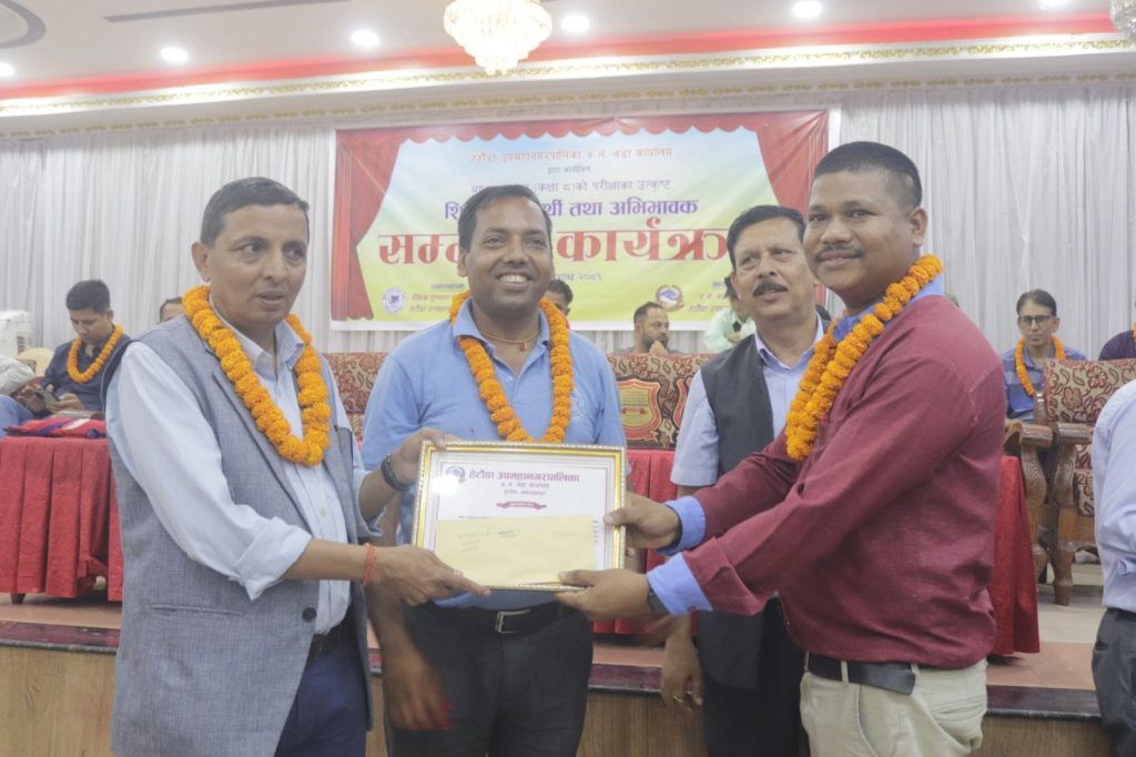 आधारभूत तह (कक्षा ८) को परीक्षामा हेटौंडा ४ नम्वर वडामा रहेका सामूदायिक तथा संस्थागत विद्यालयबाट विषयगत उत्कृष्ट अंक हासिल गर्ने विद्यार्थी, विषयगत शिक्षक र उत्कृष्ट अंक हासिल गर्ने विद्यार्थीका अभिभावकलाई सम्मान गरेको हो । शैक्षिक गुणस्तर सुधार समिति हेटौंडाका संयोजक श्रीराम दाहालको अध्यक्षतामा भएको कार्यक्रममा हेटौंडा उपमहानगरपालिका मेयर मिनाकुमारी लामाको प्रमुख आतिथ्यता रहेको थियो ।