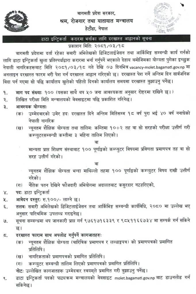 मन्त्रालयले १०० जना डाटा इन्ट्रिकर्ताका लागि विज्ञापन गरेको छ । साथै थप ५० जना आवश्यकता अनुसार रोष्टरमा राखिने मन्त्रालयको भनाई छ । सो पदका लागि १८ वर्ष पुरा भई ४० वर्ष ननाघेको नेपाली नागरिकले अनलाई मार्फत् दर्खास्त दिन सक्ने व्यवस्था गरिएको छ ।